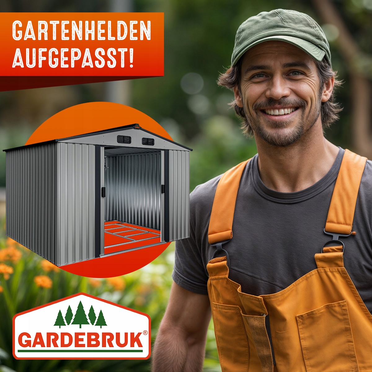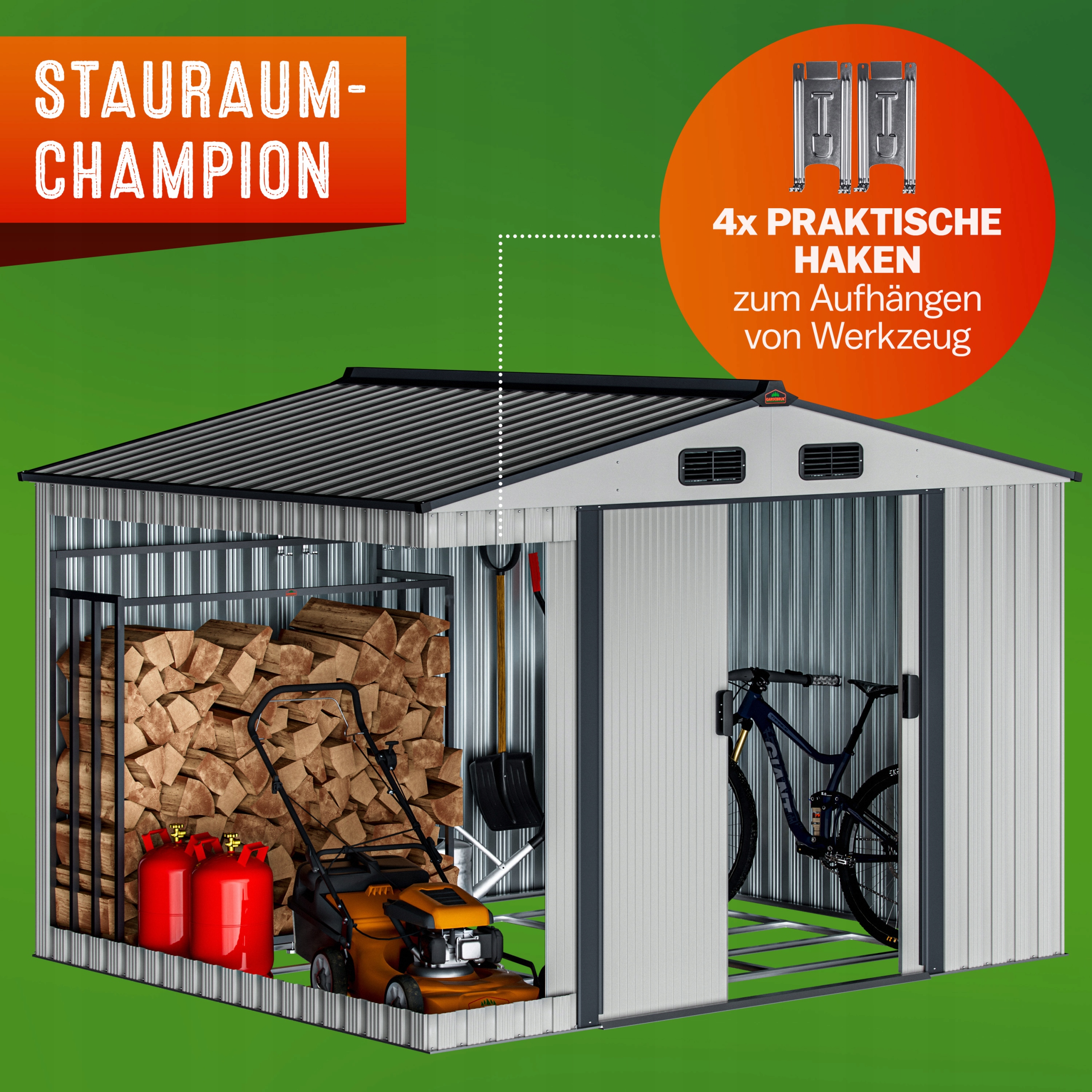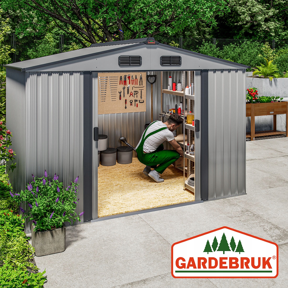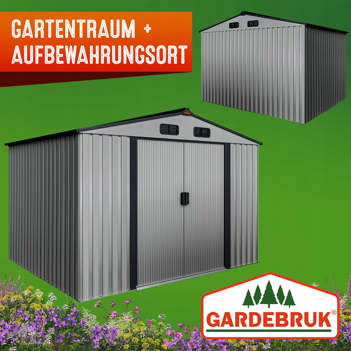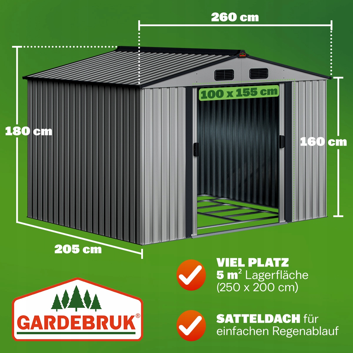 Solidna szopa ogrodowa GARDEBRUK® XXL z fundamentem umożliwia bezpieczne przechowywanie narzędzi ogrodowych. Całkowity rozmiar z dachem wynosi (dł. x gł. x wys.): 260 x 205 x 180 cm.