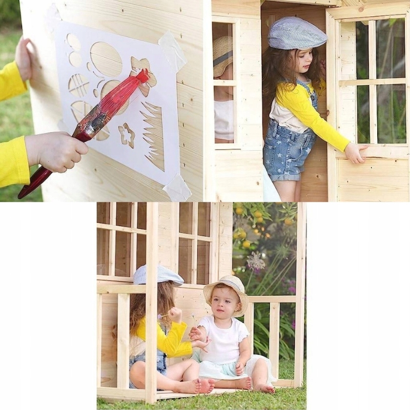 Jego przestronne wnętrze i w pełni odeskowana podłoga pozwalają cieszyć się zabawą zarówno wewnątrz, jak i na zewnątrz. Co więcej, produkt został zaprojektowany z myślą o łatwej personalizacji – do zestawu dołączono szablony dekoracyjne, dzięki którym można samodzielnie ozdobić domek, nadając mu niepowtarzalny charakter.